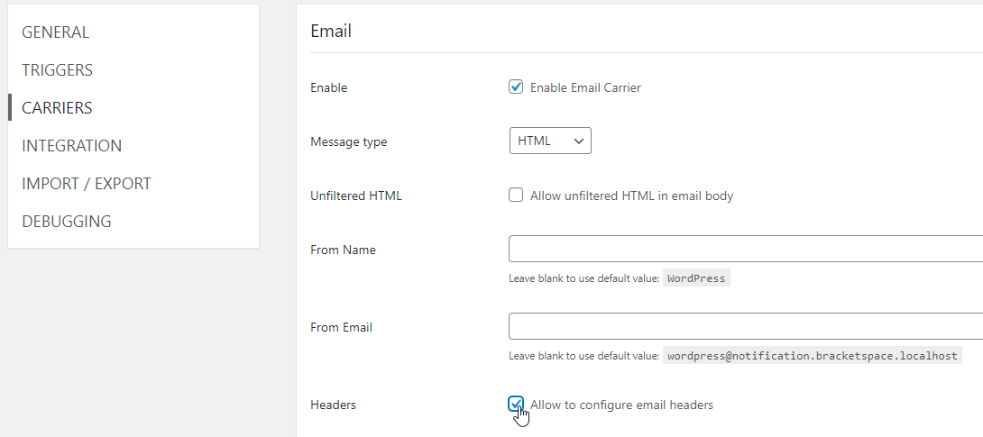 Make sure that you can setup the email headers. Go to Notification -> Settings -> Carriers -> Email and check the Allow to configure email headers checkbox.